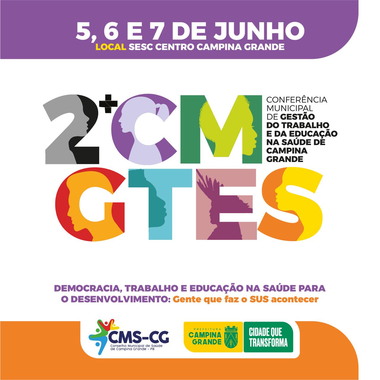 O Conselho Municipal de Saúde de Campina Grande (CMS-CG) e a Secretaria Municipal de Saúde (SMS-CG) irão realizar nos dias 05, 06 e 07 de junho, no Cine Teatro do SESC Centro, a 2ª Conferência Municipal de Gestão do Trabalho e da Educação na Saúde.