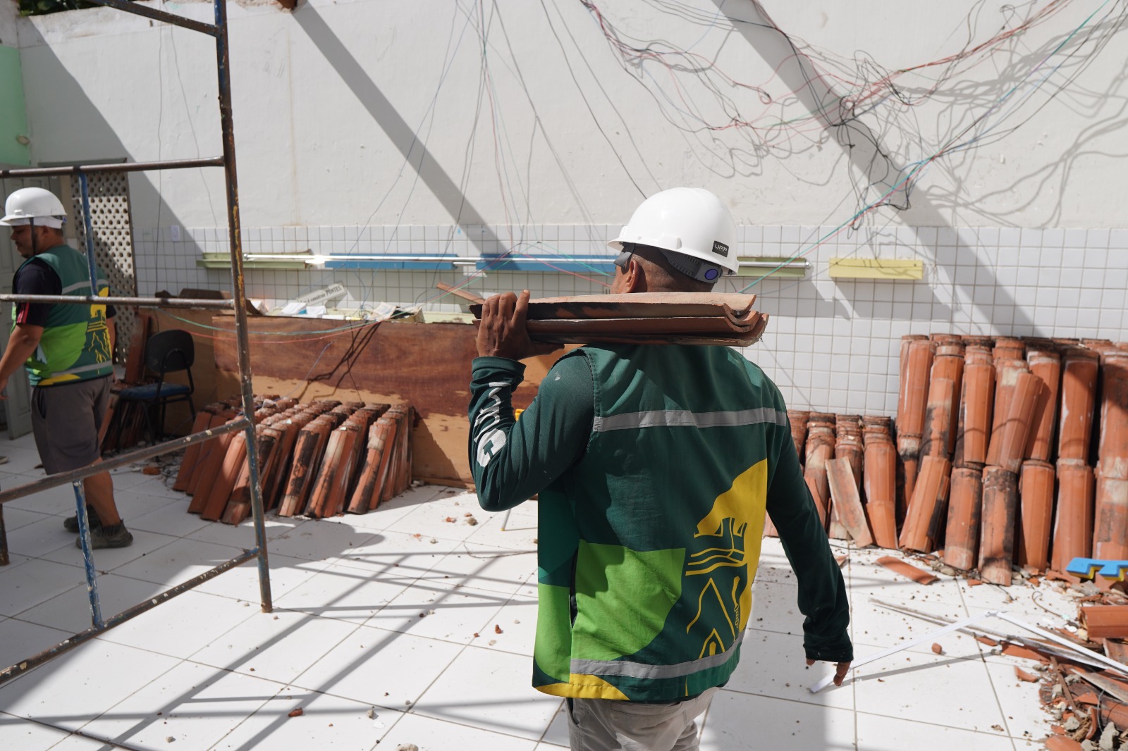 Os trabalhos incluem serviços de reparos de telhados, marcenaria e manutenção predial, com consertos e reposições de portas, fechaduras e dobradiças, aplicação de fitas antiderrapantes e intervenções pontuais, como o chumbamento de grades em áreas de circulação.