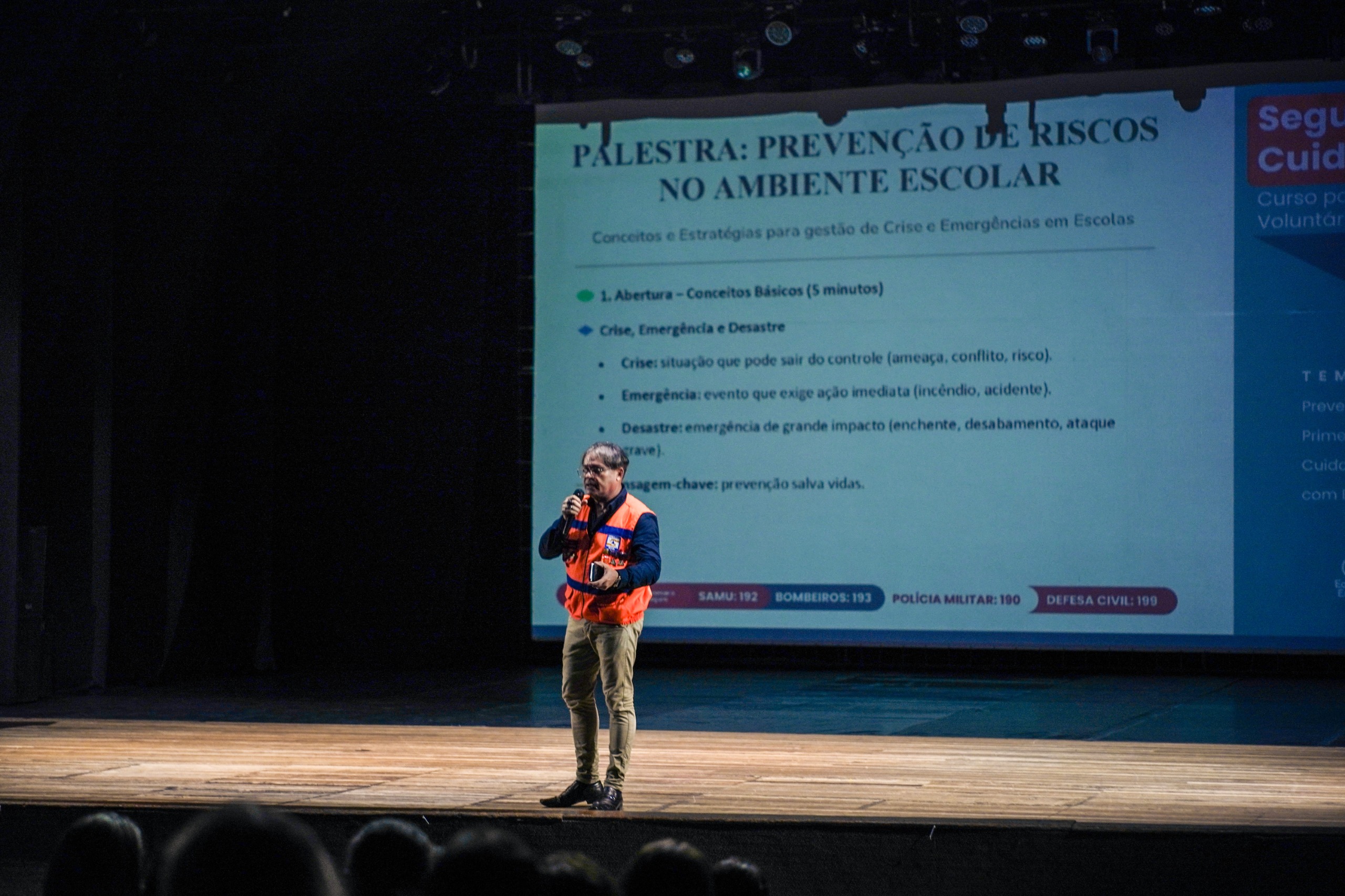 A formação marca o início de um ciclo de capacitações voltadas à prevenção de riscos e aos cuidados em situações de emergência no ambiente escolar. Nesta primeira etapa, os participantes acompanharam duas palestras. A primeira foi ministrada pela psicóloga Cíntia Azevedo, que abordou aspectos emocionais relacionados à prevenção de situações de risco. Em seguida, o técnico da Defesa Civil, Danilo Horácio de Souza, apresentou orientações práticas de segurança e prevenção de riscos.
