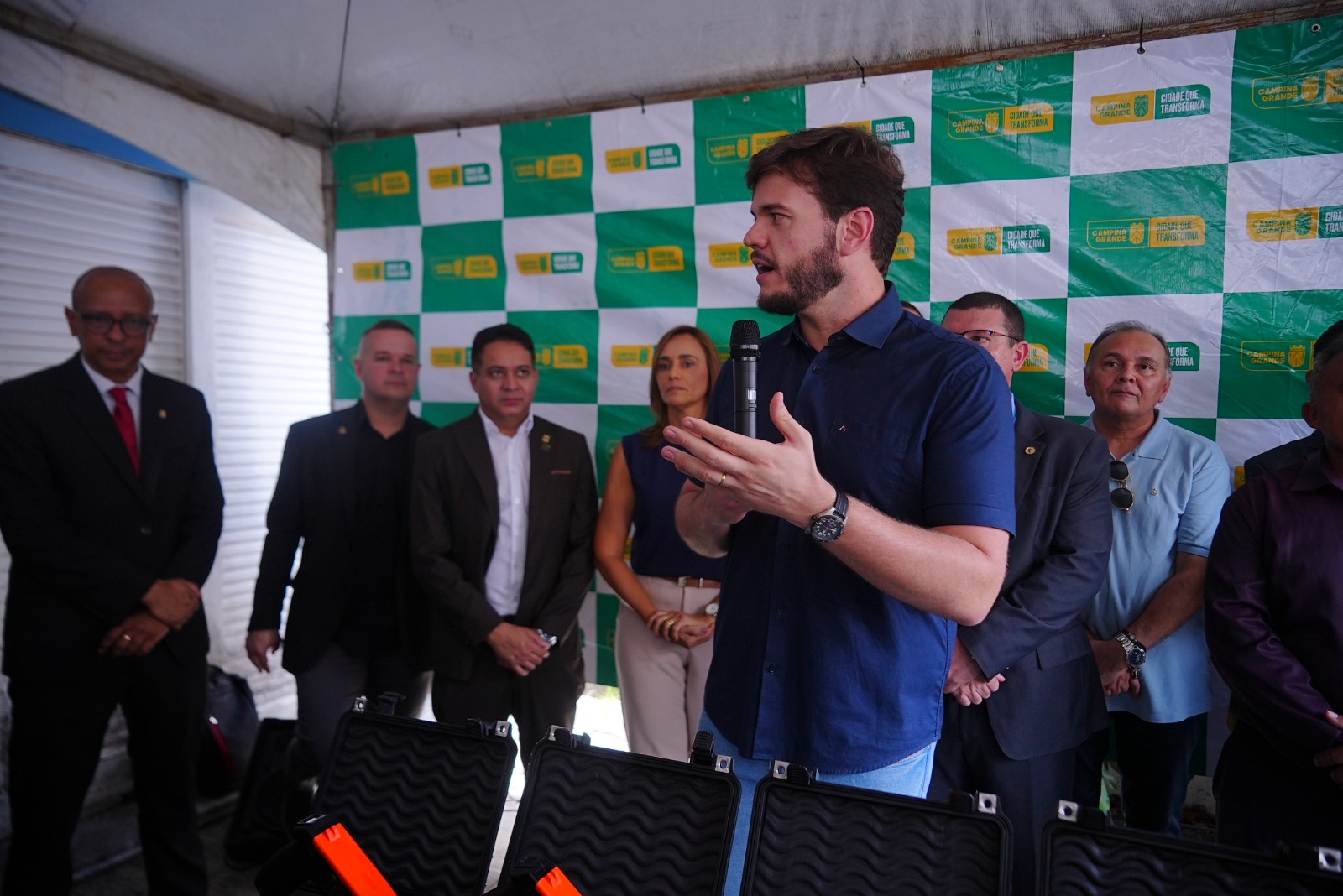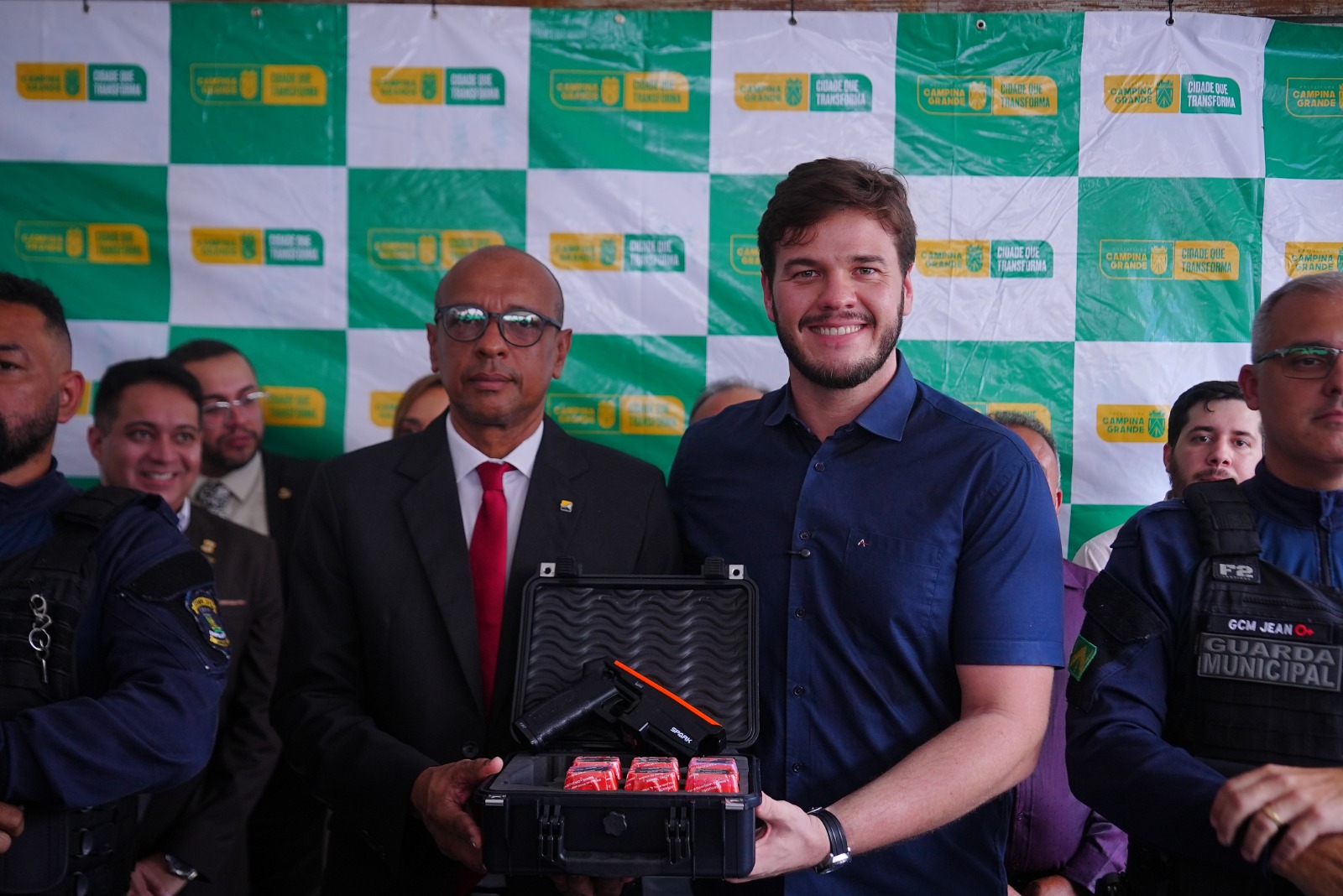 O prefeito Bruno Cunha Lima fez a entrega das chaves das motos, equipamentos de informática e de proteção e das armas não letais. Um dos Guardas Civis do Município fez uma demonstração do uso da arma não letal ao prefeito e aos participantes da solenidade.