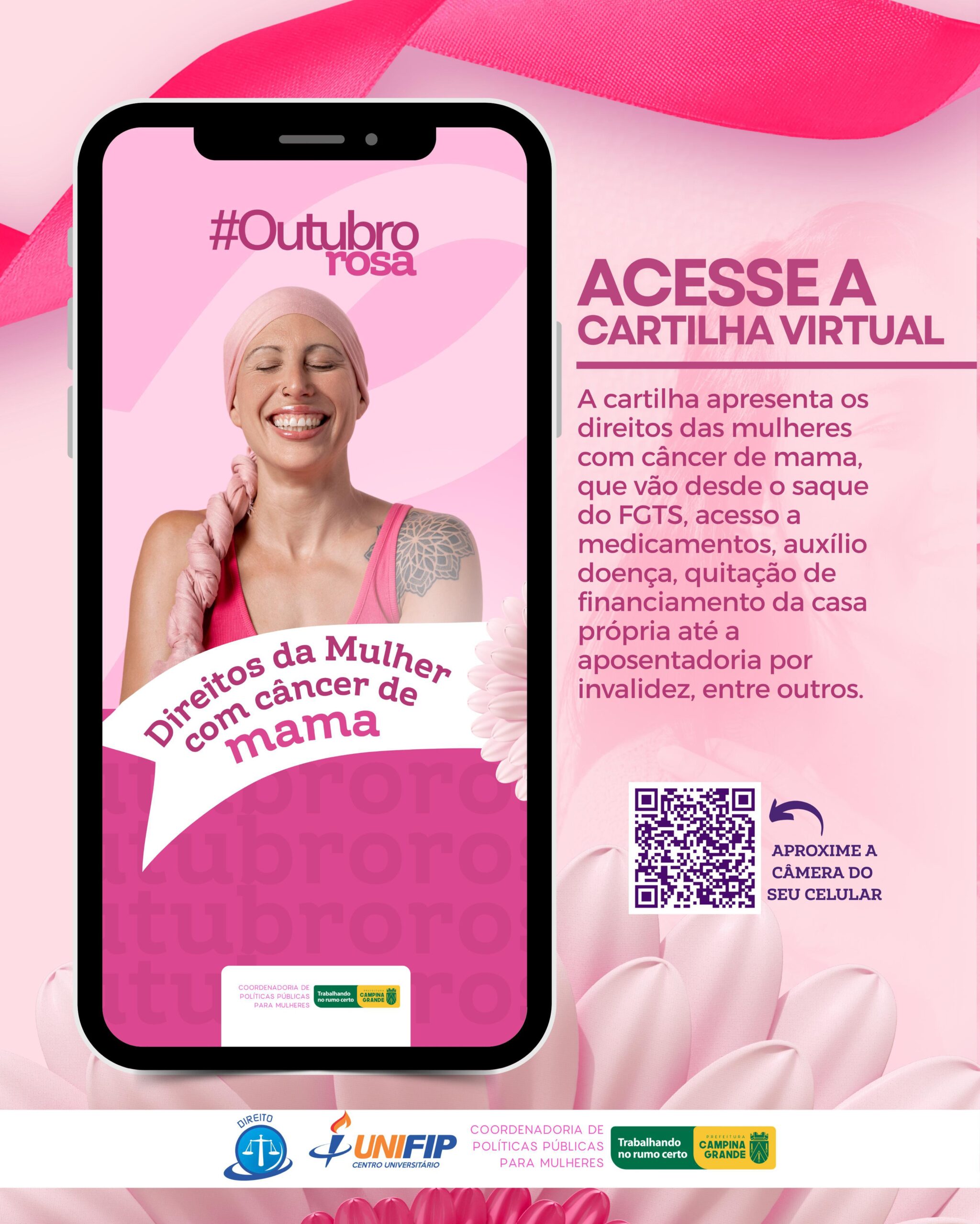 A Prefeitura de Campina Grande, por intermédio da Coordenadoria da Mulher, em alusão a Campanha Outubro Rosa, lançou neste dia 1 de outubro no instagram @coordenadoriadamulhercg a cartilha virtual que apresenta os direitos das mulheres diagnosticadas com câncer de mama. A cartilha foi criada pela Coordenadoria de Políticas Públicas para Mulheres em Campina Grande e este ano traz como parceiros estudantes de direito da Universidade Federal de Patos-Campus Campina Grande (Unifip).