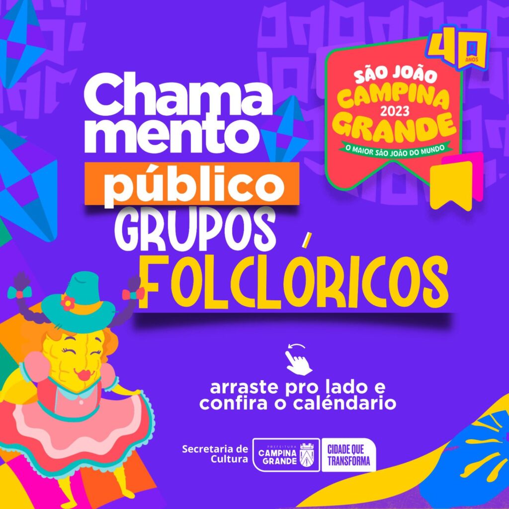 A Prefeitura de Campina Grande, através da Secretaria de Cultura (Secult), lançou nesta sexta-feira (5), um edital de chamamento para credenciamento, com o objetivo de contratação de Grupos Folclóricos locais. Junto do edital foi divulgado o cronograma para o processo, nele fica estabelecido o prazo de 10 a 12 de maio para entrega de envelopes lacrados com a documentação necessária, o dia 16 para a sessão pública e o dia 19 para divulgação do resultado final.