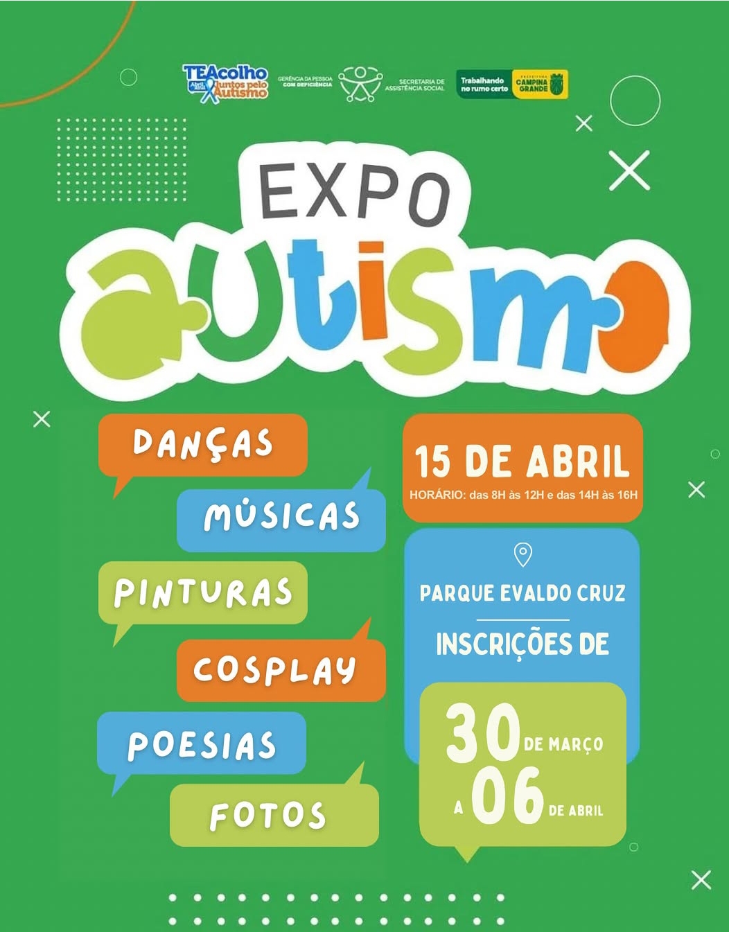 A Prefeitura de Campina Grande realizará a quarta edição da ExpoAutismo nesta quarta-feira, 15, no Parque Evaldo Cruz, das 8h às 12h e das 14h às 16h. A organização é da Gerência da Pessoa com Deficiência (PcD), vinculada à Secretaria Municipal de Assistência Social (Semas) e acontecerá pelo terceiro ano consecutivo dentro da programação do TEAcolho, fazendo alusão ao mês da Conscientização do Autismo.