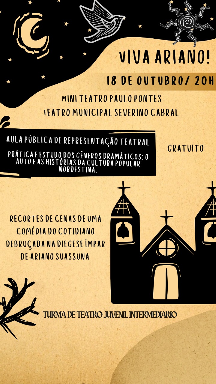 No sábado, 18, às 20h, o público poderá acompanhar o projeto “Viva Ariano”, uma aula pública de representação teatral inspirada no legado de Ariano Suassuna.
